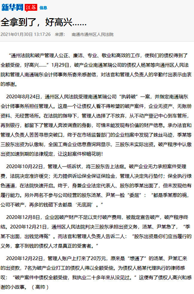 近日“南通瑞東會(huì)計(jì)師事務(wù)所”的名字,不斷出現(xiàn)在《新華網(wǎng)》《江蘇法制報(bào)》的報(bào)道之中。一個(gè)小會(huì)所名字出現(xiàn)到主流新聞媒體中,實(shí)屬罕見。這要從我所承辦的一起破產(chǎn)案件說起。